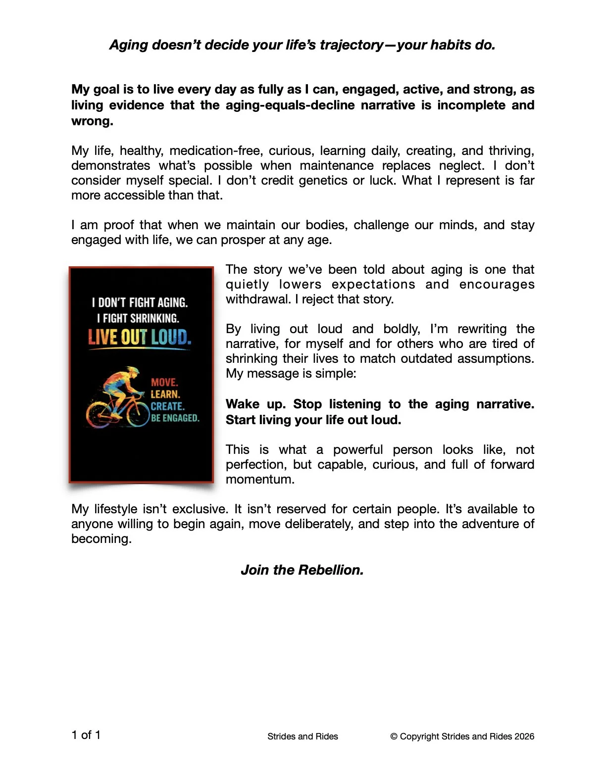 My goal is to live every day as fully as I can, engaged, active, and strong, as living evidence that the aging-equals-decline narrative is incomplete and wrong.